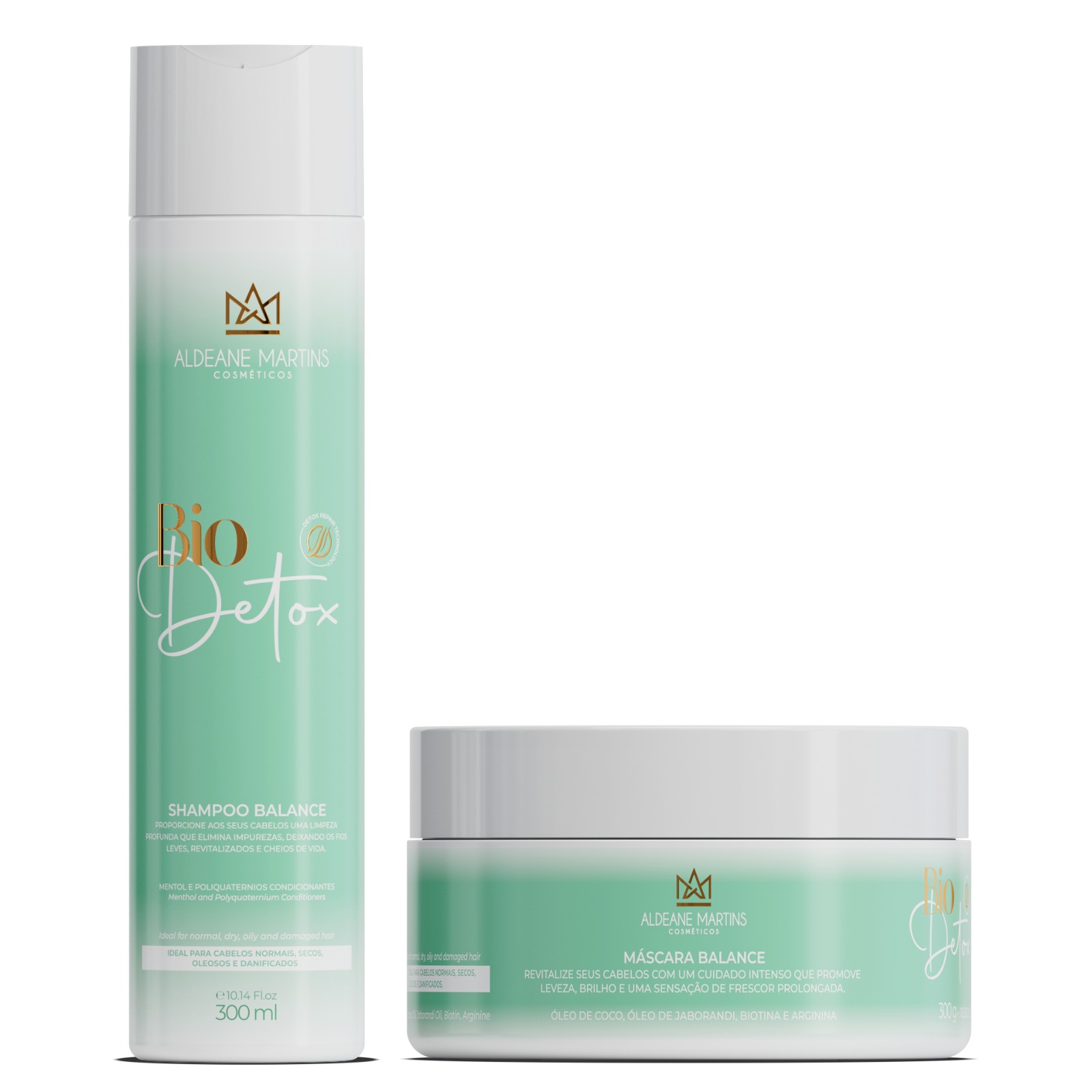 O Kit Bio Detox Profissional da marca Aldeane Martins tem a função de limpar profundamente os fios e o couro cabeludo. Composto por Shampoo Bio Detox (300ml) e Máscara Bio Detox (300g). Este kit é a solução ideal para quem deseja uma cabeleira mais saudável, resistente e livre de impurezas.